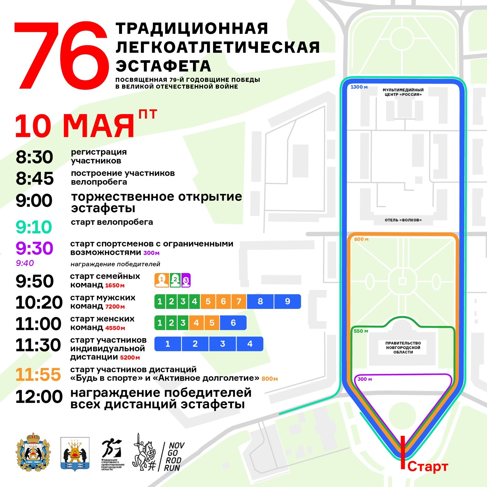 76 традиционная легкоатлетическая эстафета, посвященная 79 годовщине Победы в Великой - Отечественной войне, многоэтапная эстафета среди коллективов физической культуры, спортивных клубов, индивидуальные соревнования на дистанции 4,9 км
