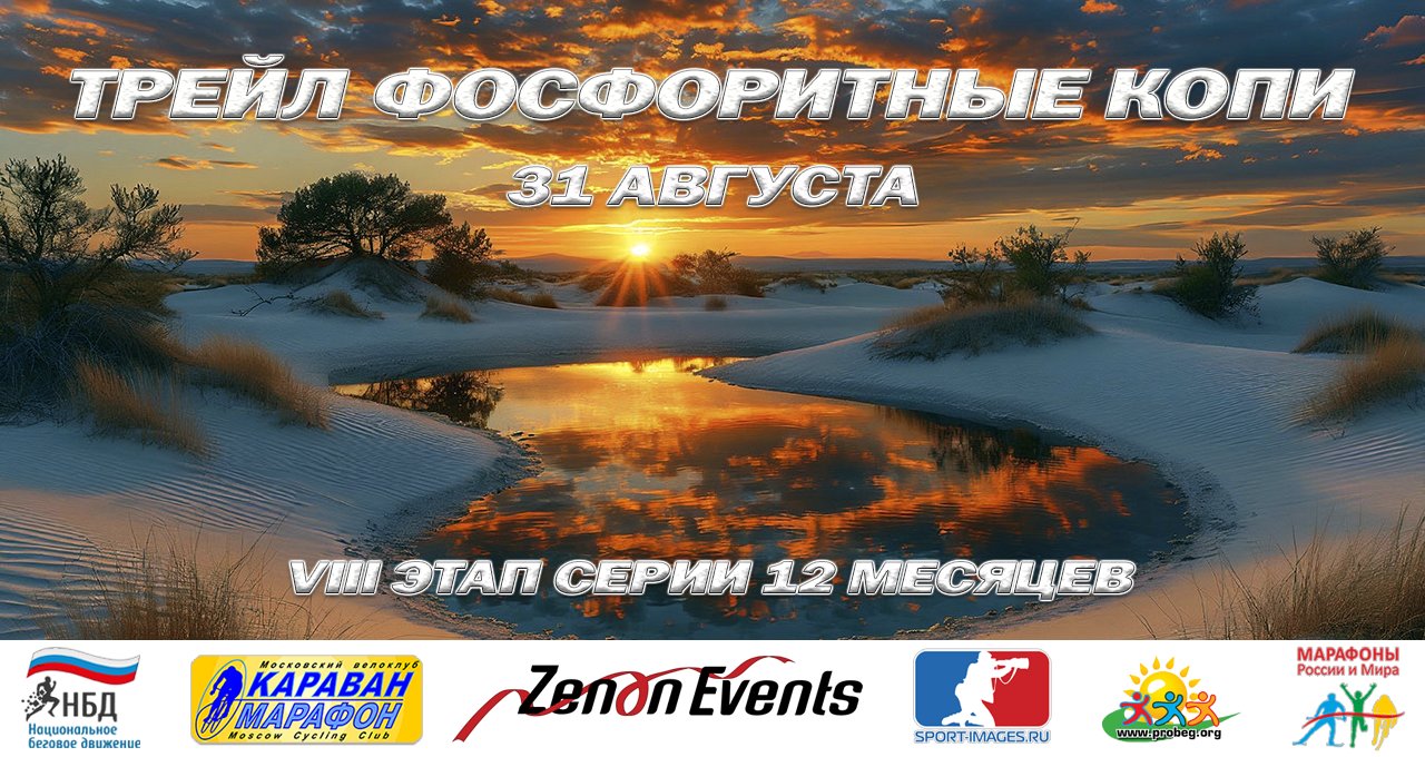 Августовский этап Фосфоритные копи пройдет в одном из самых загадочных мест Подмосковья. Добыча фосфоритов? под Воскресенском привела к созданию здесь неземных пейзажей, напоминающих лунную? поверхность! Затопленные карьеры с черной, оранжевой, зеленой и голубой? водой сменяются песчаными барханами ослепительно белого и красного цвета, постепенно переходя в лес, засеянный стройными рядами сосен?! А чтобы ваши впечатления были еще сильнее, мы проводим этот старт на закате?!